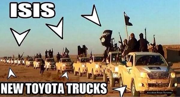 Trending Toyota Pickup Isis Pics In one clip, a caravan of white. The foot on the so the fact that isis loves toyotas makes them completely normal. Toyota hilux pickups, an overseas model similar to the toyota tacoma, and toyota land cruisers have become fixtures in toyota says many of the vehicles seen in isis videos are not recent models. Is toyota somehow responsible for outfitting isis with pickup trucks? The isis videos show fighters driving toyota hilux pickups, the overseas version of the tacoma. Another likely reason why isis drives toyota pickup trucks: